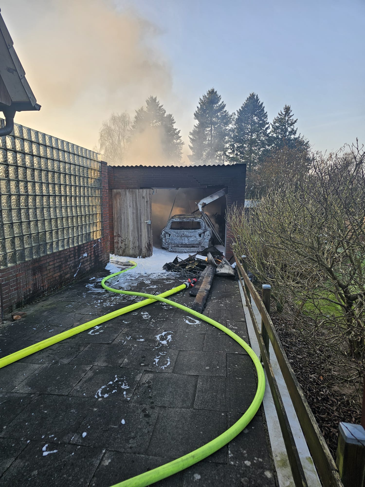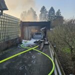 Vor Ort brannte eine PKW in einer Garage bereits in voller Ausdehnung. Die Besatzung des ersteintreffenden Fahrzeuges begann sofort mit dem Aufbau einer Wasserversorgung und unter Atemschutz mit der Brandbekämpfung.